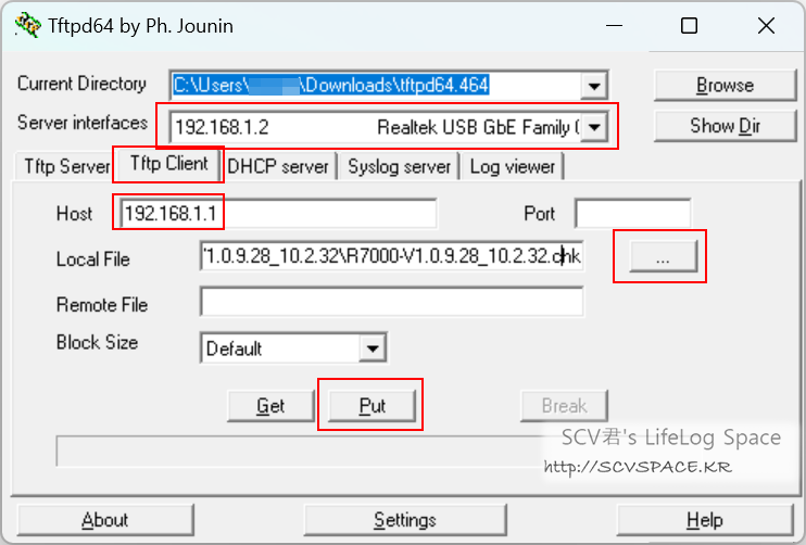 4. 1번 LAN포트에 연결한 컴퓨터에서 tftp 클라이언트를 사용해 R7000으로 펌웨어 파일을 전송시키면