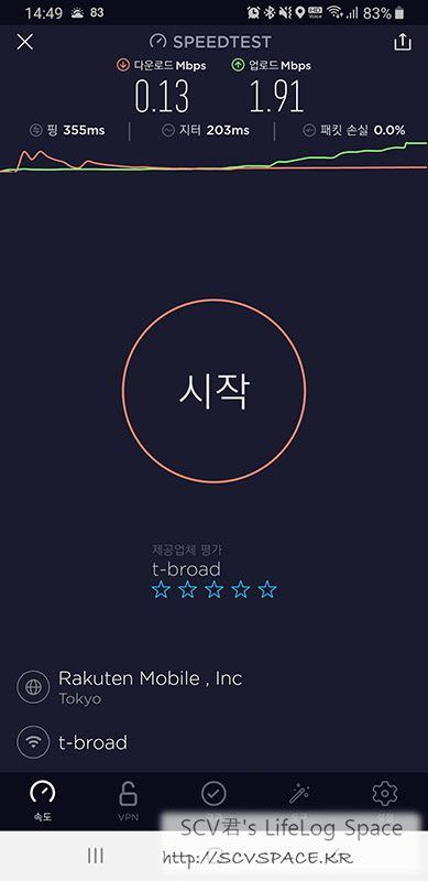 니코니코동화와 속도 테스트를 하는건 아니지만, 역시나 모뎀 수준의 속도를 자랑하던 테스트 서버를 지정해서 속도 테스트를 진행한 모습입니다.