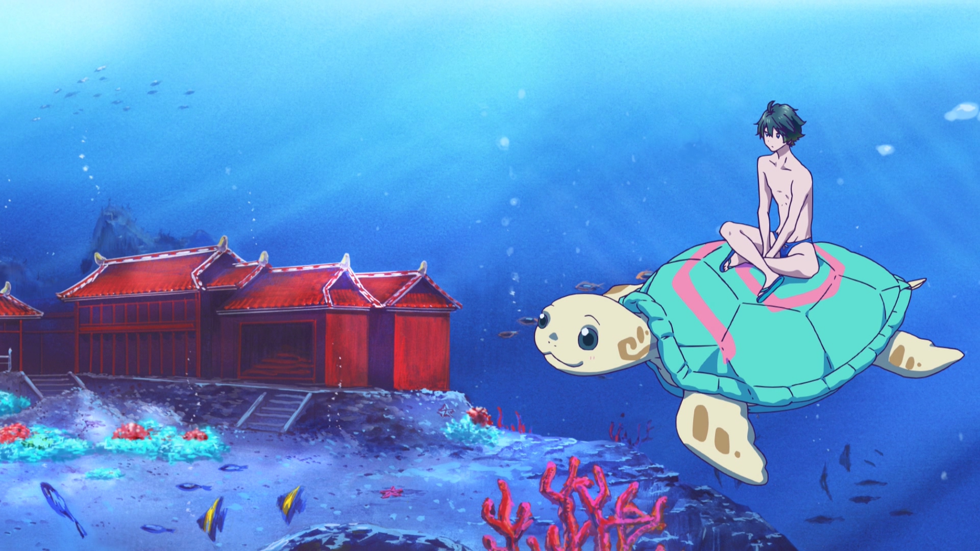 해변에서 만난 바다거북 팬텀에게 초대받아 바닷속 용궁으로 가게 된 하루히코.