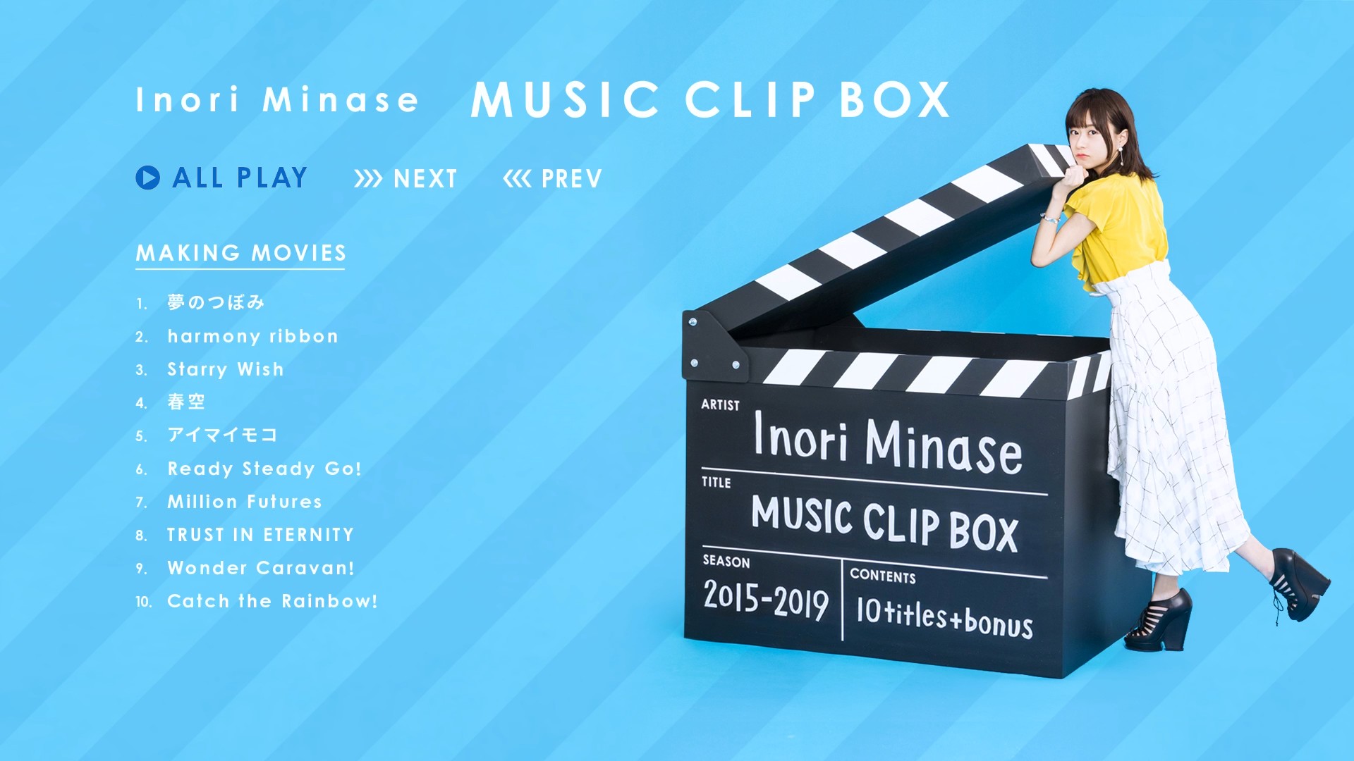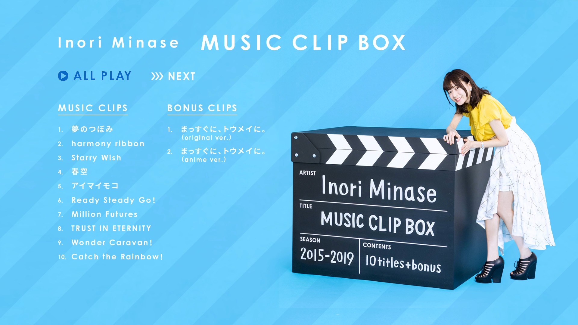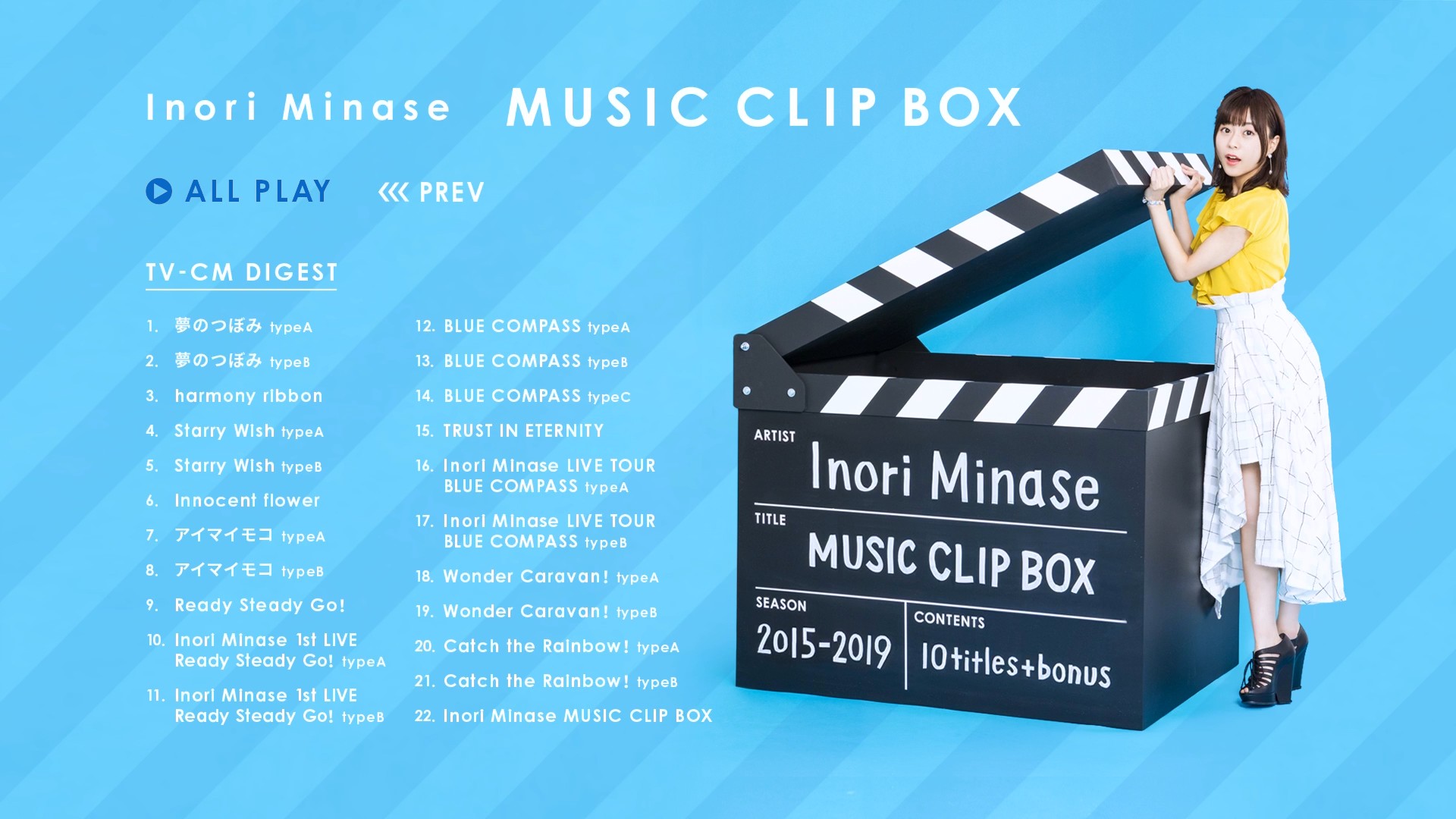 데뷔 싱글인 '夢のつぼみ' 부터 이 타이틀인 'MUSIC CLIP BOX' 까지의 싱글, 앨범, DVD/블루레이 의 CM을 모았습니다.