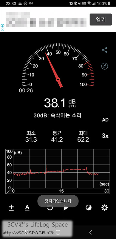 위에서 제품을 켜기 전이 38dB 정도였고, 1단계에서 40dB, 2단계에서 43dB, 3단계에서 48dB이 되었습니다.