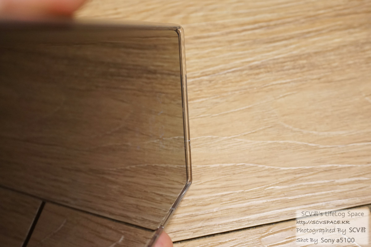 이렇게 케이스를 씌워도 위 사진 기준으로 오른쪽 아래의 모서리 부분이 바닥에 훨씬 자주 닿을것 같은 느낌.