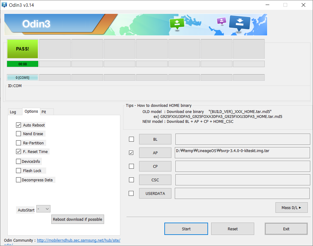 삼성 ODIN으로 tar 로 끝나는 이미지 파일을 플래싱하는 과정.