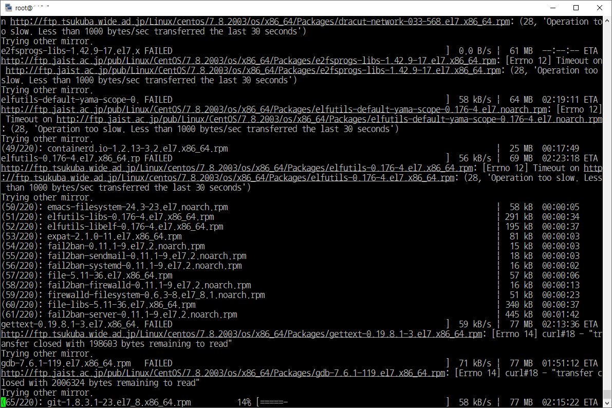 자세히 보니 저렇게 타임아웃 나는 미러서버 URL이 전부 일본 도메인이었습니다.