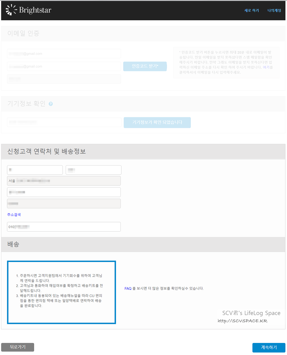 먼저 입력한 기기 정보도 넘어왔고, 이제 추가로 필요한 이름이나 주소, 전화번호를 입력받는 단계입니다.