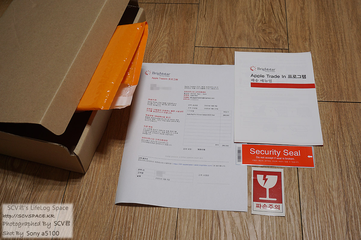 동의서나 안내서, 기기 포장용 완충봉투, 스티커(박스 밀봉 혹은 주의표시용) 정도가 들어있습니다.
