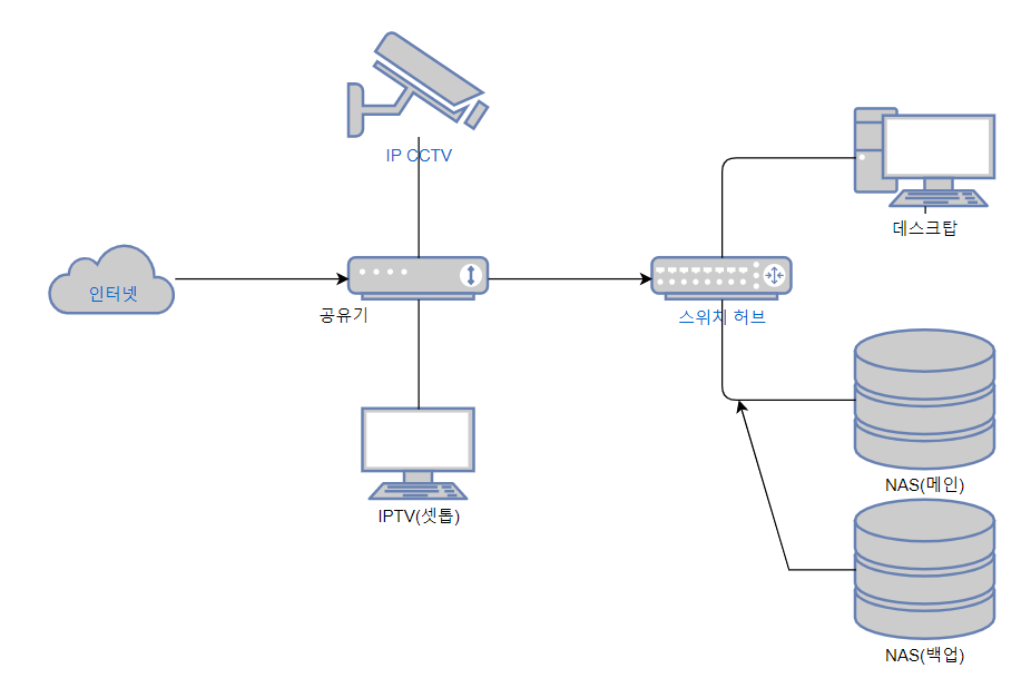 비교적 적은 트래픽이 발생하는 IP CCTV나 특정 조건에서 받는 트래픽이 많아지는 백업용 NAS는 허브 아래에 연결.