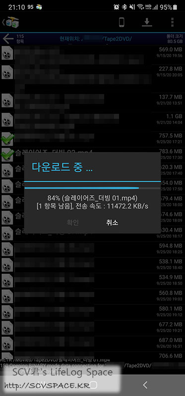 같은 환경에서 NAS -> 갤럭시 노트20 울트라로 파일 전송하니 속도가 1/4 가까이 줄었습니다.