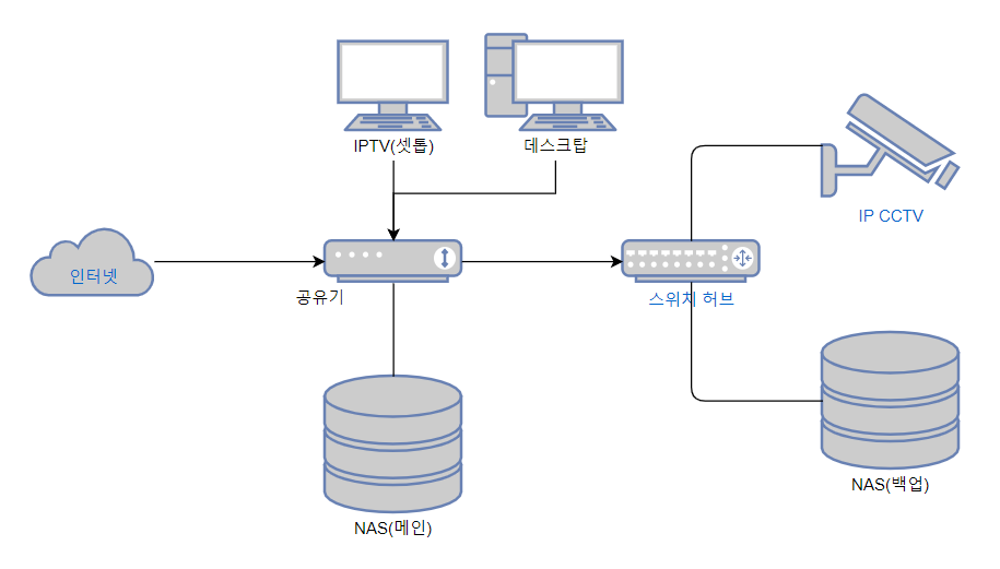 비교적 적은 트래픽이 발생하는 IP CCTV나 특정 조건에서 받는 트래픽이 많아지는 백업용 NAS는 허브 아래에 연결.