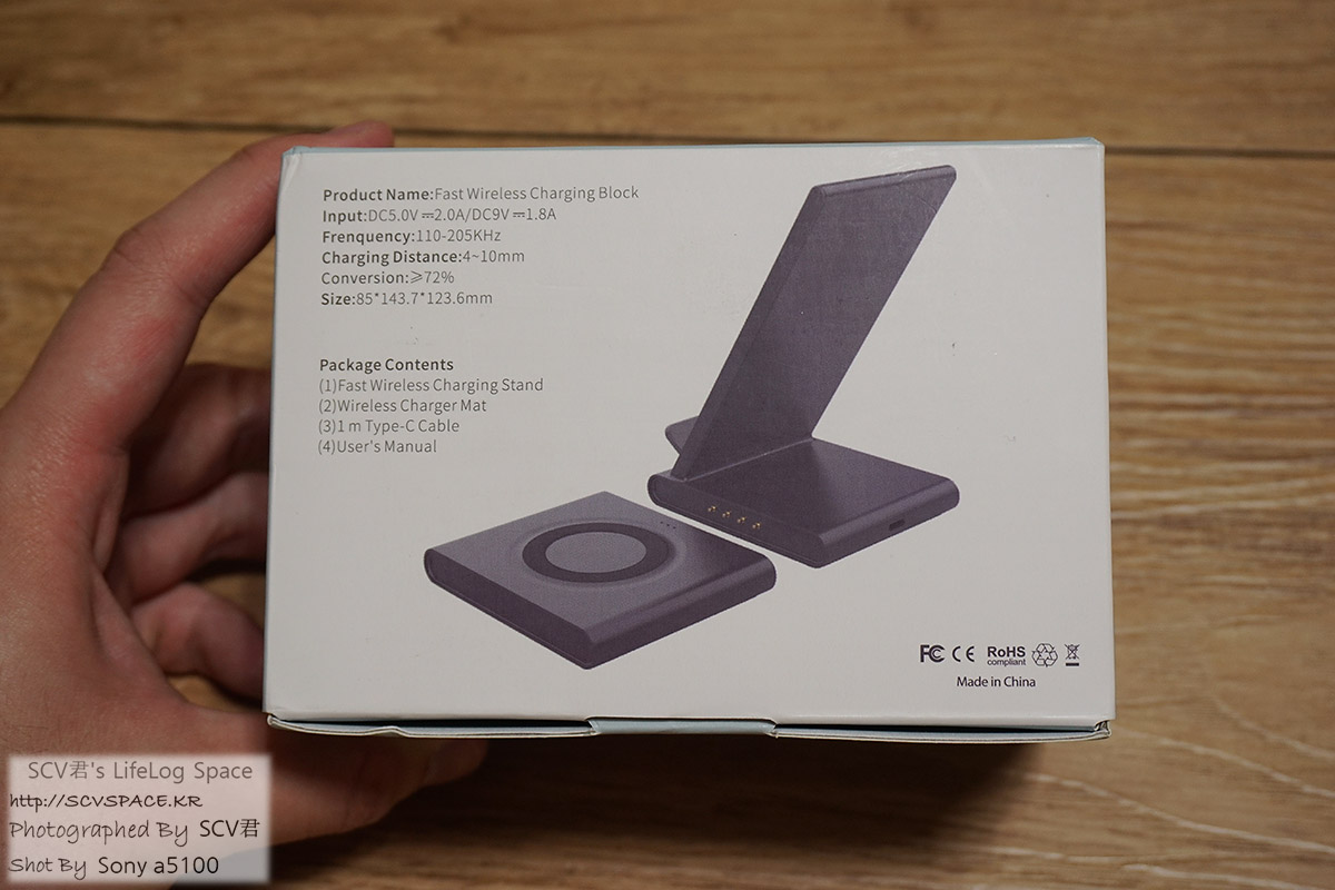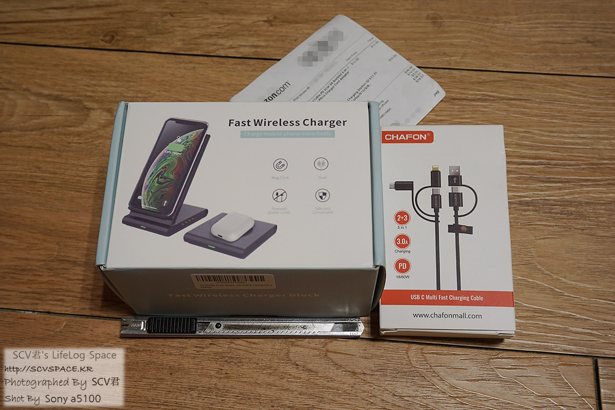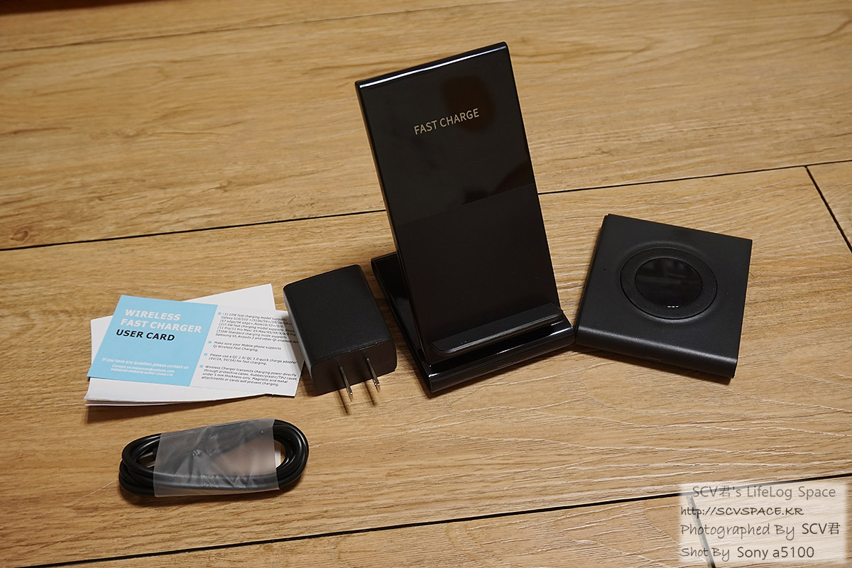 구성품은 무선충전 모듈들, Q.C3.0 대응 충전기, USB-C 케이블, 설명서.
