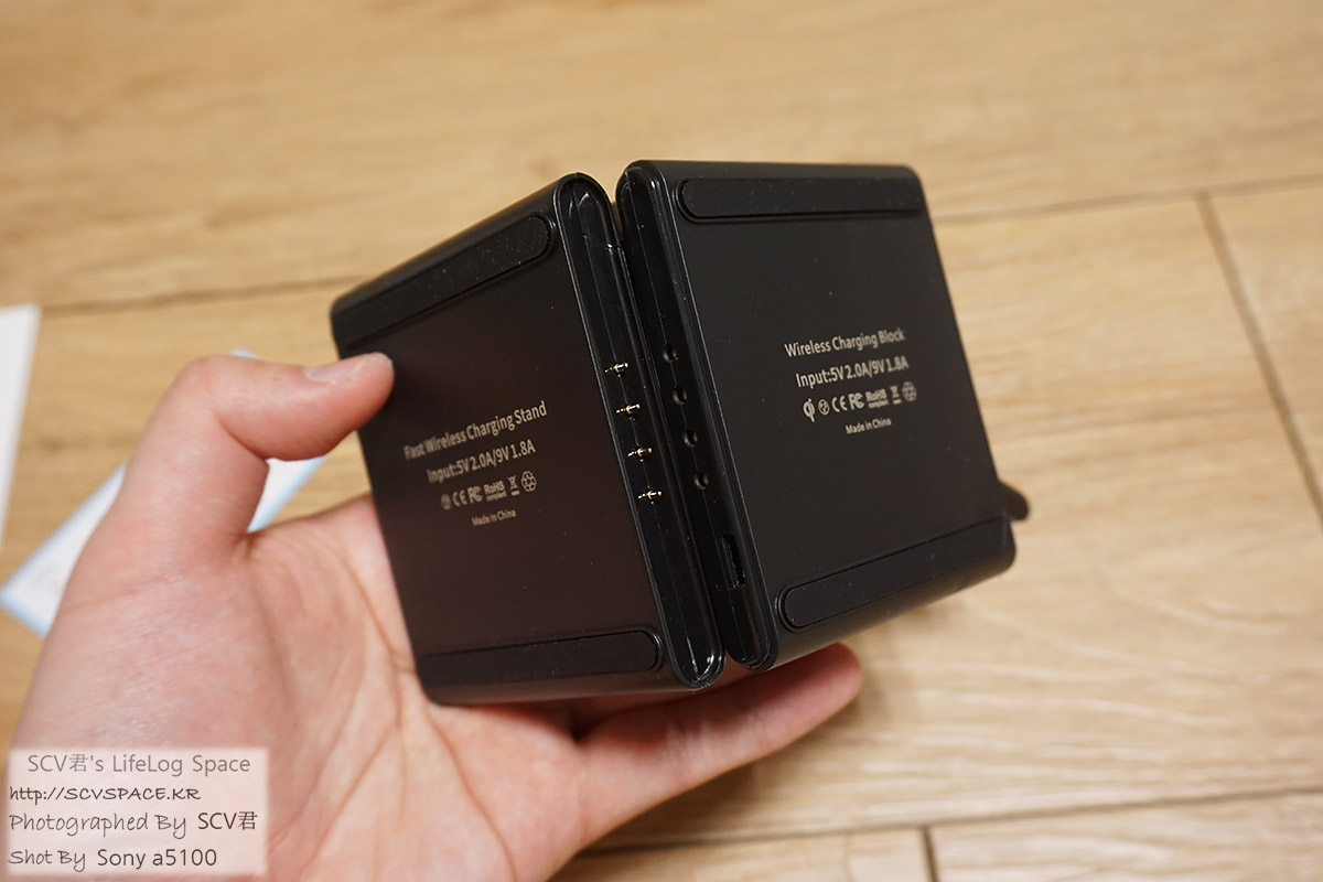 두개의 무선충전 모듈이 있고, 한쪽에만 케이블을 연결하면 두 모듈을 동시에 쓸 수 있습니다.