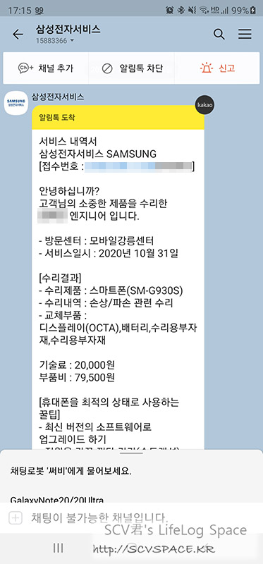 교체비용은 약 10만원 정도 소요됐습니다(정확히는 99,500원) 상세내역은 위 알림톡을 확인해주시면 되고.
