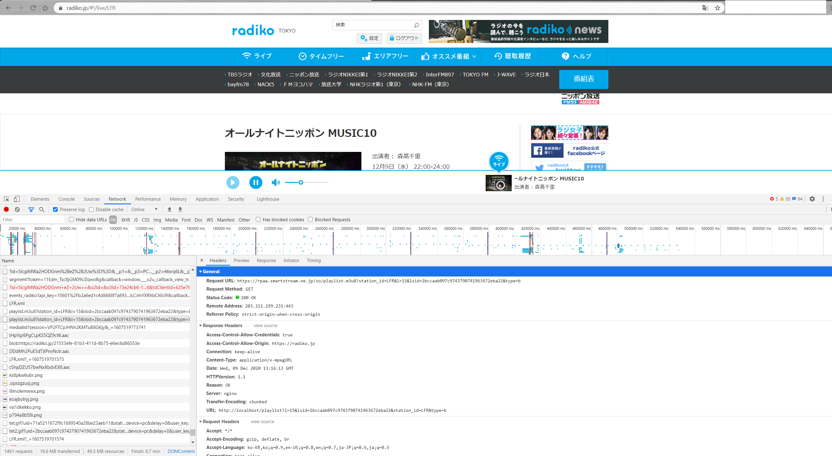 radiko의 경우는 이 m3u8 뒤에 ? 로 추가되는 GET 방식 파라메터가 몇개 더 붙지 않으면 호출이 실패하는 구조였습니다. (Header의 인증Key는 이전과 동일하게 필수)