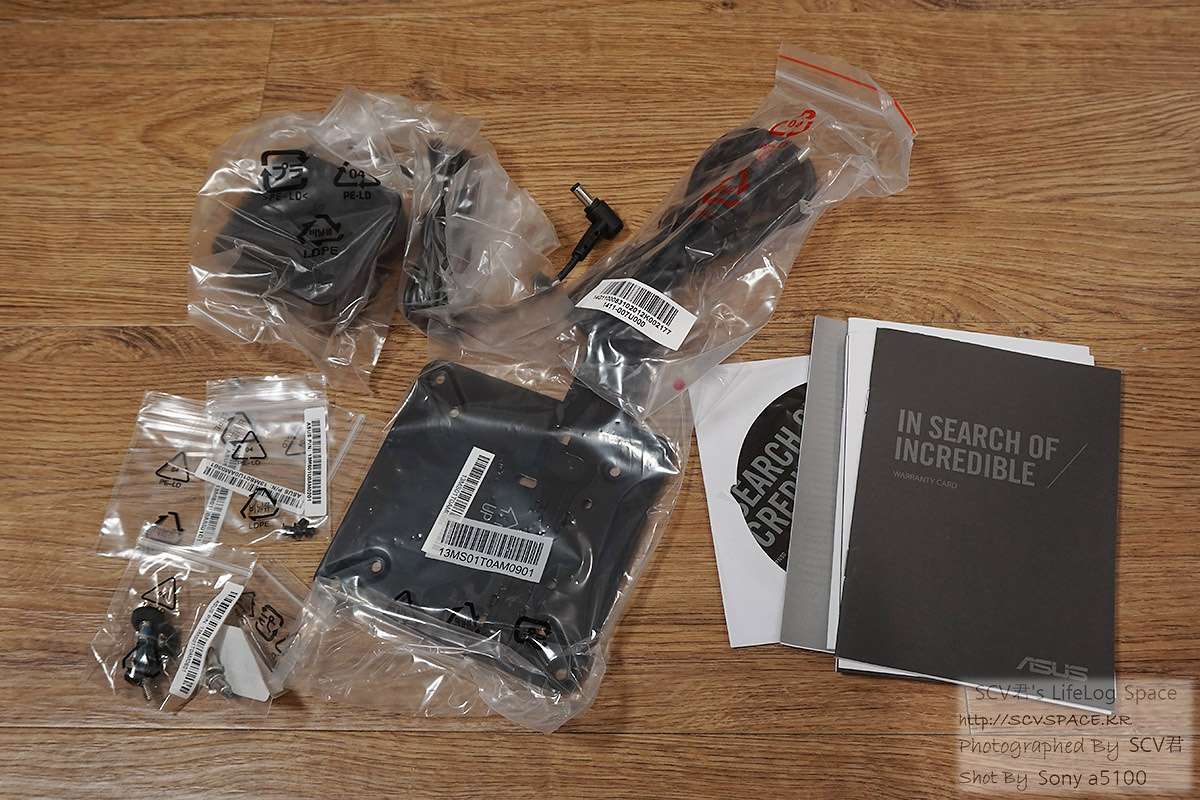 오른쪽의 설명서 아래 물건들을 빼내 보면, 모니터 뒤에 장착 가능한 지지대와 나사, 전원 어댑터, 내부 부품장착용 나사 정도가 보입니다.