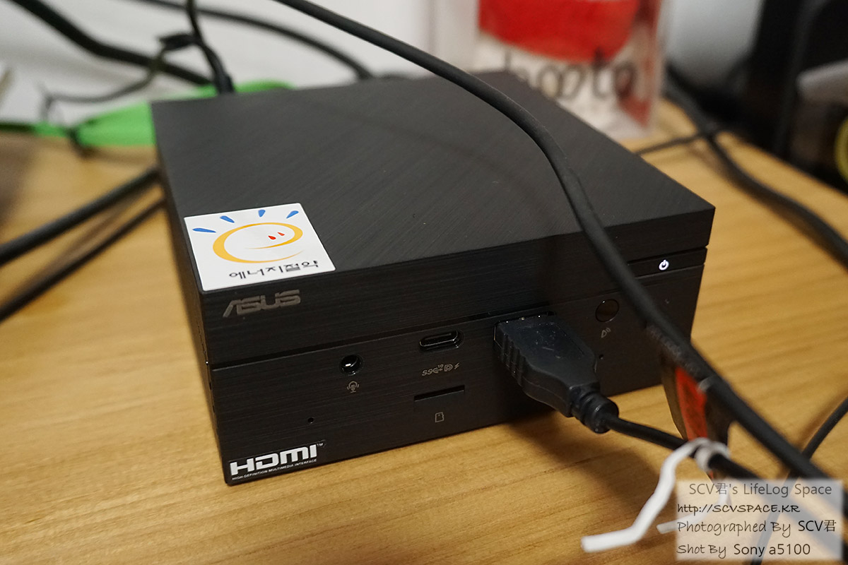 초기 설정이라 USB 마우스, 키보드를 연결하고, 유선 LAN에 전원케이블 꽂으니 주변이 조금 혼잡하군요.