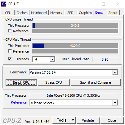 왼쪽의 대충 9년 된 샌디브릿지(Intel i5-2500) 이 싱글 340.9, 멀티 1329.9가 나왔고,