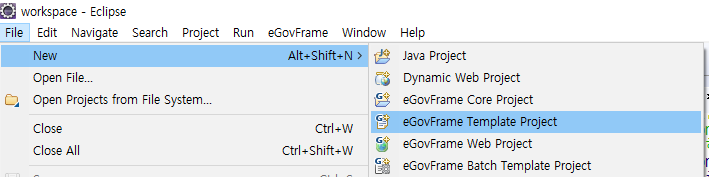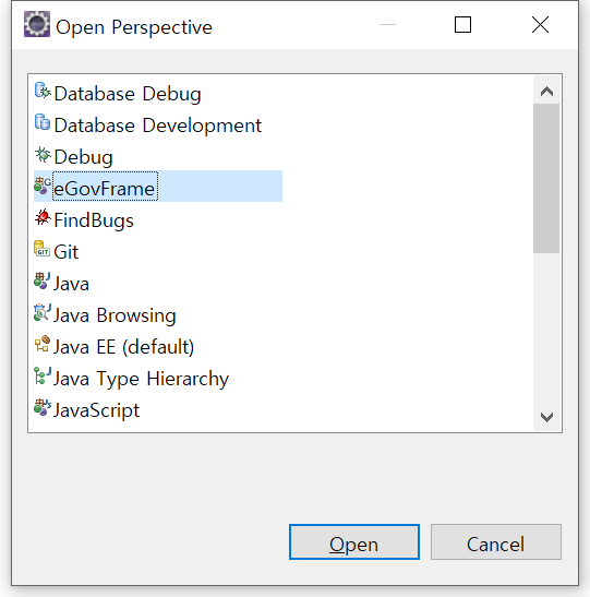 실행되고 나면 Perspective를 eGovFrame 으로 변경하고,