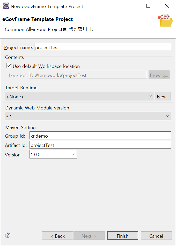 경로나 이름, Group Id는 임의로 입력하시면 되고, Dynamic Web Module 버전은 3.1로 선택했습니다.