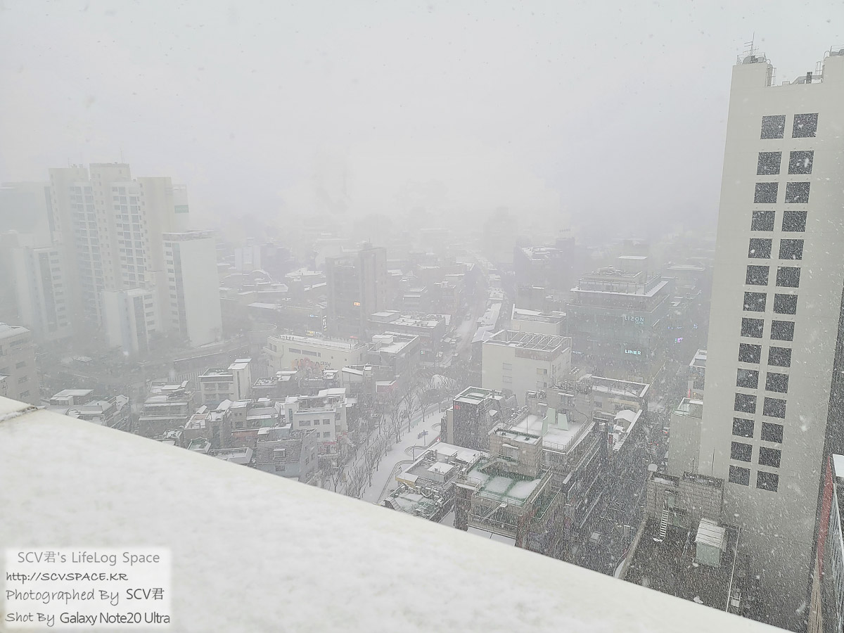 건물 위쪽의 흡연구역이 바깥으로 뚫려 있어서 한번 나가봤더니, 눈보라로 멀리 보이지도 않네요.