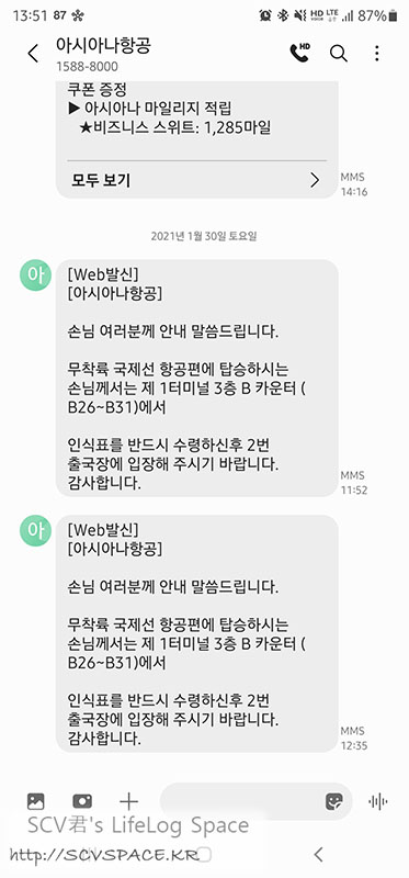 현재 인천국제공항은 코로나19 대응모드라 그에 관한 안내가 문자와 이메일로 이뤄졌습니다.