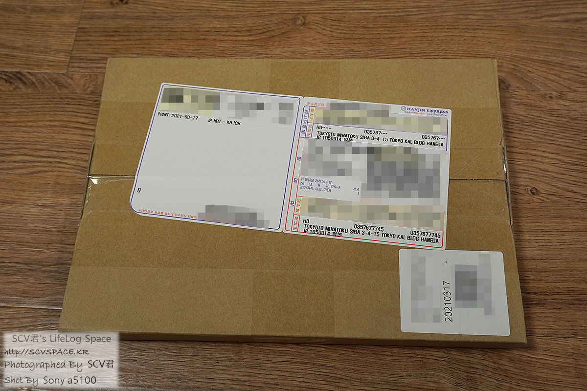 배송된 박스 앞쪽에는 이하넥스 일본 물류창고에서 쓰였을 이하넥스 관리번호 스티커와(오른쪽 아래) 국내까지의 배송 운송장이 붙어있습니다.