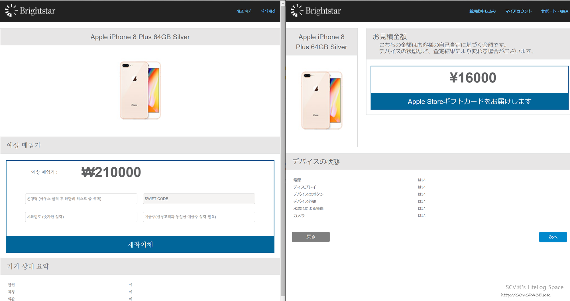 같은 시리얼넘버로 우리나라와 일본의 트레이드인 가격(계좌입금)을 비교한 모습인데,