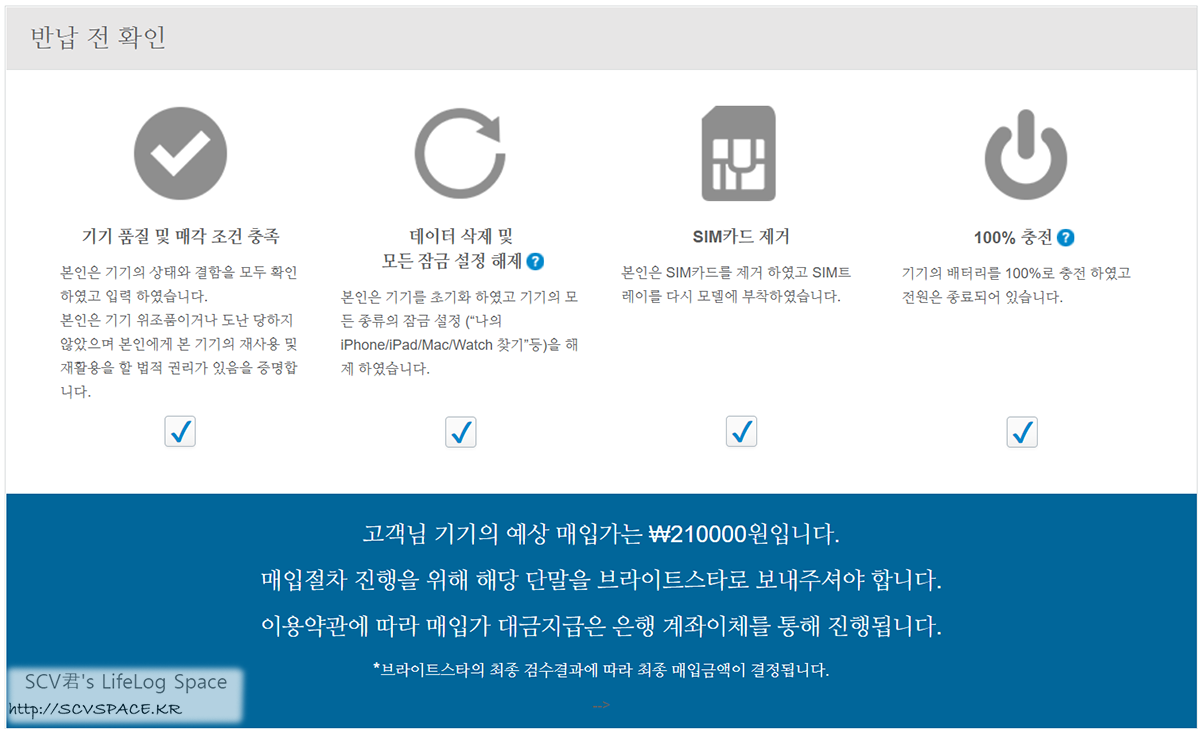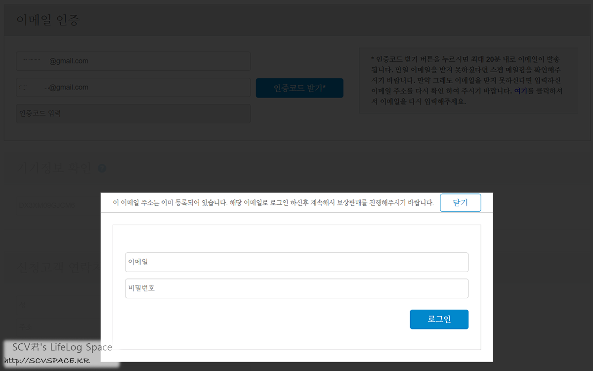 시리얼 등의 기기 정보와 기기 발송용 박스 배송용 주소 등의 정보를 입력하고, 최종 체크사항에 확인하면 신청 절차는 끝.