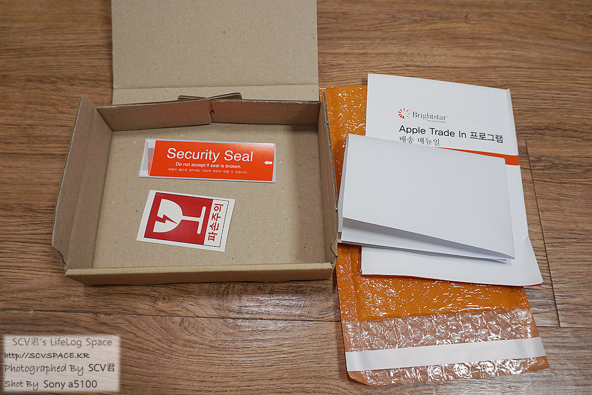 파손주의 스티커와 봉인씰은 아이폰을 넣고 나서 포장할 때에 필요한 것들이고, 오른쪽의 매뉴얼은 참고용, 완충봉투는 기기 포장용, 종이 하단 동의 사인은 기기 소유자 검증용.