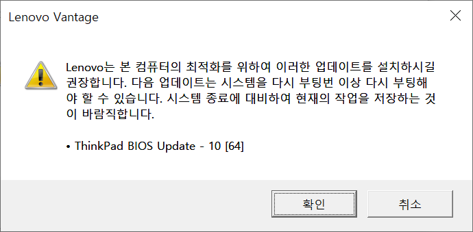 아까 BIOS 업데이트를 권했던 레노보 관리프로그램을 통해 다른 장치의 드라이버/펌웨어도 추가 업데이트.