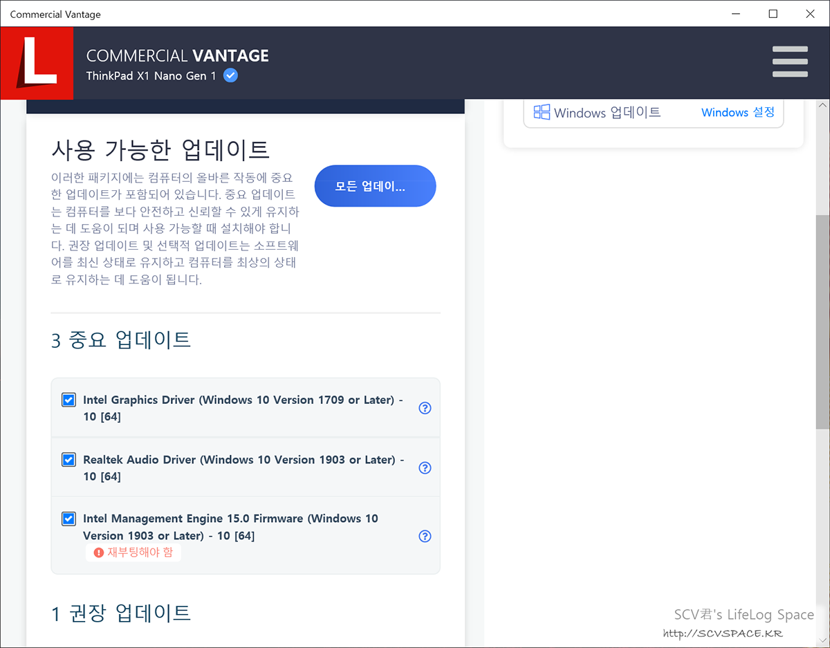 아까 BIOS 업데이트를 권했던 레노보 관리프로그램을 통해 다른 장치의 드라이버/펌웨어도 추가 업데이트.