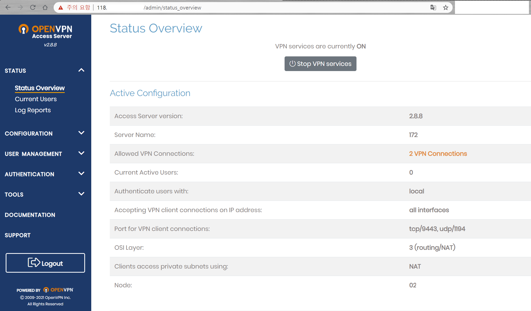 URL은 서버 공인IP, 하단 상태페이지에는 Docker상 IP Docker 에 올라가 있다 보니 나중에 클라이언트 ovpn 파일을 다운로드 받으면 내부IP가 잡혀서 수정이 필요하긴 합니다만,