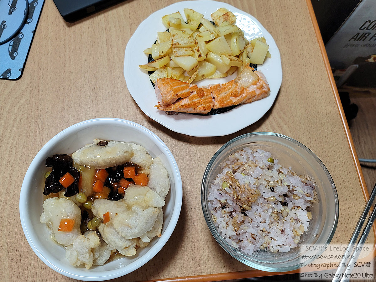 덕분에 밥반찬으로 조선호텔 탕수육(밀키트)과 연어구이(에어프라이어), 감자전 해먹고 남은 감자가 한 상에 놓이는 사태가.