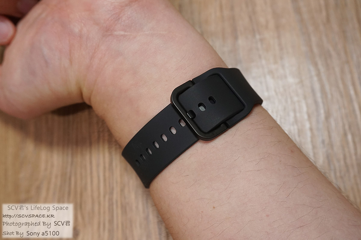 기어핏2 밴드가 재질은 동일하게 실리콘이지만 한쪽 밴드의 구멍에 끼워서 고정하는 방식이라,