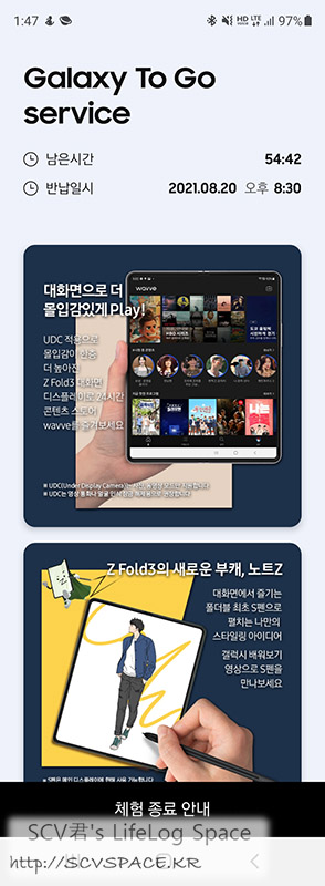 갤럭시 TO GO MDM 프로파일이 설치된 폴드3에는 이렇게 TO GO 서비스용 앱을 통해 대여 잔여시간을 확인할 수 있게 되어있습니다.