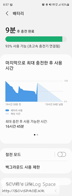 30분쯤 걸려 씻고 나와도 여전히 충전중 그리고 예약구매 전에 꼭 검증하고 싶었던 배터리 사용 및 충전시간은 대략 이렇게 나왔습니다.