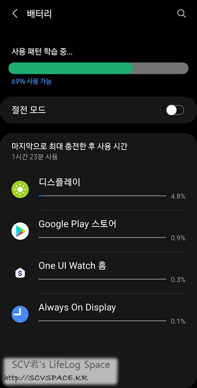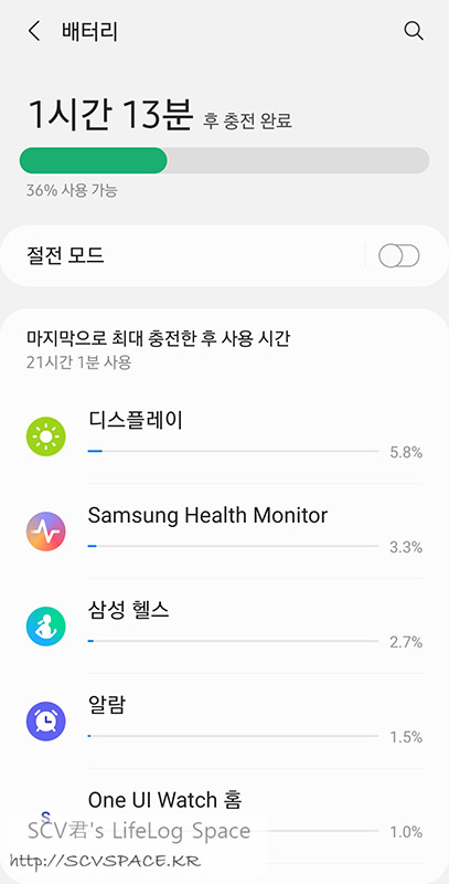 이렇게 셋팅을 마치고 69%가 된 워치4를 100%로 완충한 뒤부터 다시 21시간 정도 쓴 뒤의 배터리 소모량.
