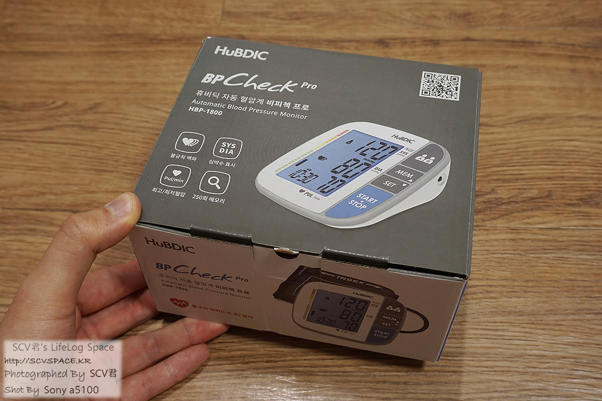 그게 이 제품. 건전지 넣고 커프를 착용한 뒤 시작을 누르면 최고/최저 혈압을 측정해 줍니다.