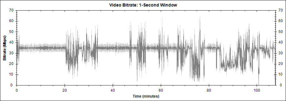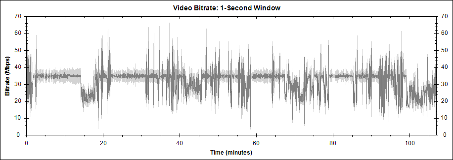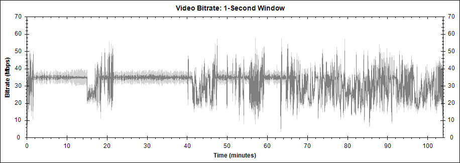 평균 비디오 비트레이트는 31971 kbps, 1080i. 1:47:42초짜리 본편은 30.7GB, 2.02GB(7분짜리 스탭롤) m2ts 2개로 구성되어 있습니다.