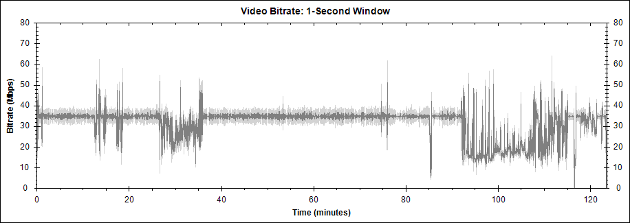 평균 비디오 비트레이트는 31850 kbps, 1080i. 2:03:30초짜리 본편은 35.4GB, 2.02GB(7분짜리 스탭롤) m2ts 2개로 구성되어 있습니다.