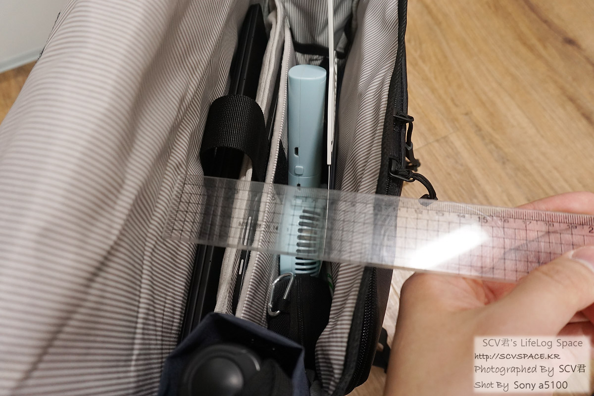 체감상 안쪽을 9-10Cm 너비로 쓸 수 있어서, 노트북과 태블릿이 다 들어가도 나머지 짐 넣는데 문제가 없었습니다.