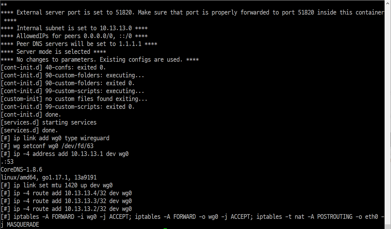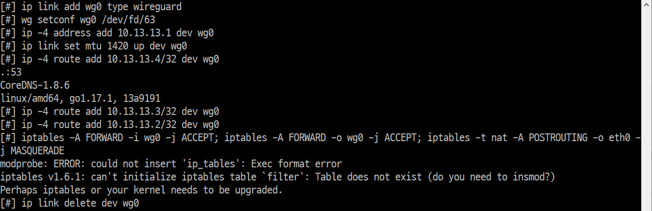 여기에 WireGuard 모듈이 설치가 안되어있으니 컨테이너는 실행되는데 서비스가 에러나더군요.