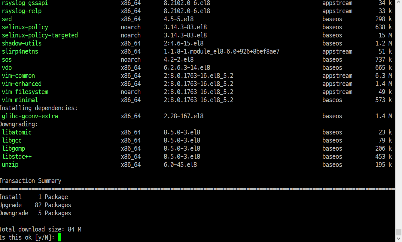 CentOS 8 서버에 리포지토리만 Stream 8로 변경한 상태니, 이걸 Stream 리포지토리의 패키지와 일치시킬 차례입니다.