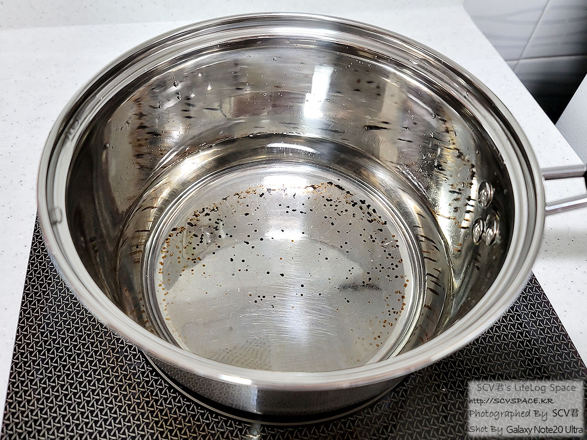 며칠 전에 만두랑 시루떡을 찜기로 데워먹었는데, 물 양 계산 실수 때문에 찜기에서 떨어진 재료가 적어진 물에서 졸아 탔습니다.