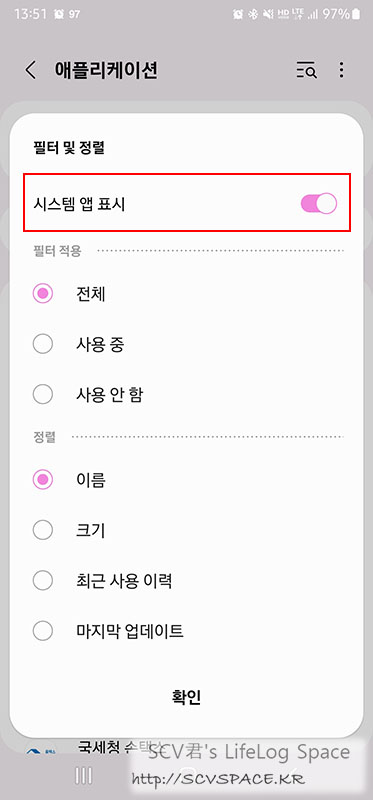 혹시 목록에 안보인다면 '앱 목록' 이 있는 줄 오른쪽의 아이콘을 눌러 '시스템 앱 표시' 를 선택해 줍니다.