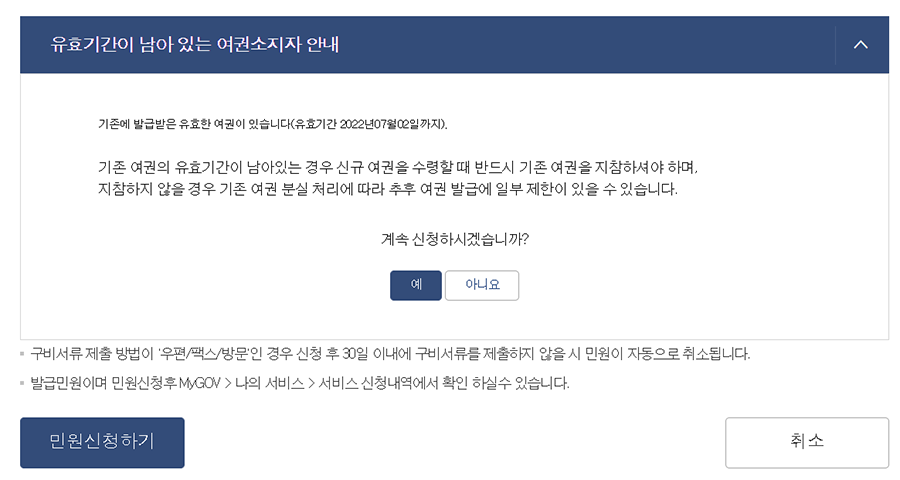 해당 정보로 여권 정보를 조회해서 저처럼 유효기간이 남은 여권이 있으면 안내문이 보입니다.