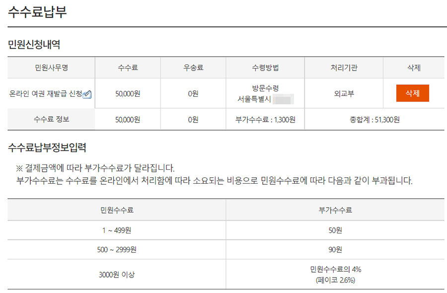 신청이 잘 됐다면 수수료를 결제할 수 있는 화면으로 넘어옵니다.