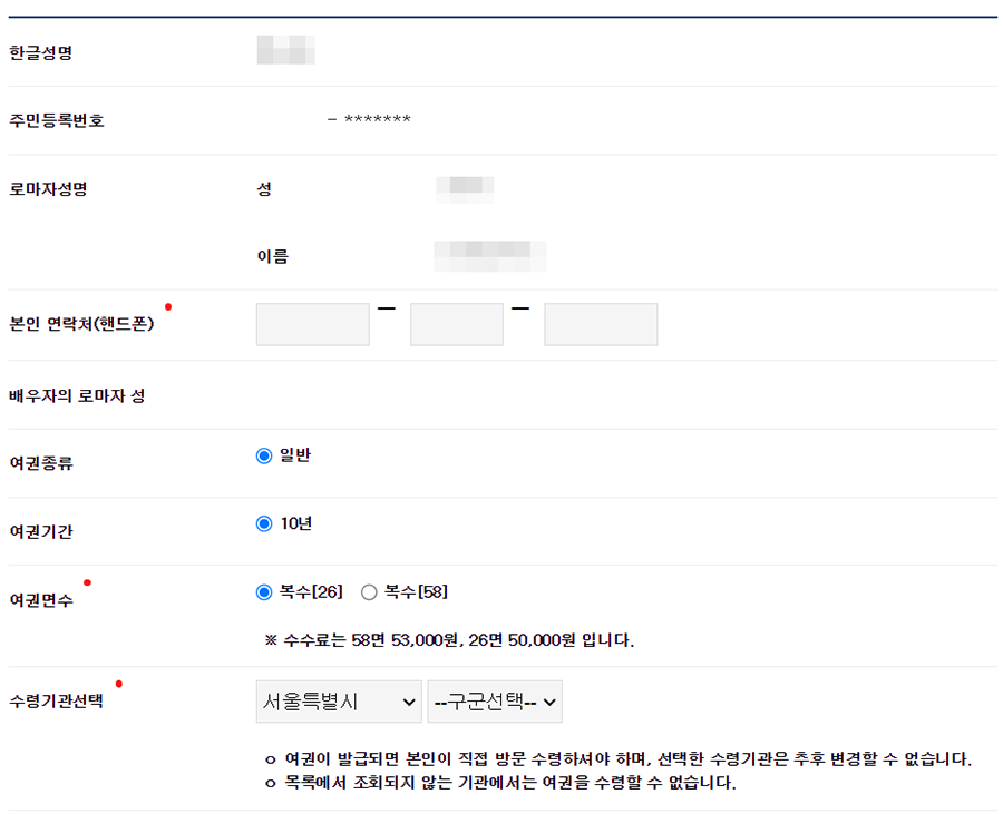 기본적으로 여권신청에 들어가는 수수료는 10년 복수여권 사증란 26면 기준 50,000원입니다(발급수수료+국제교류기여금, 58면 선택시 3,000원 추가)