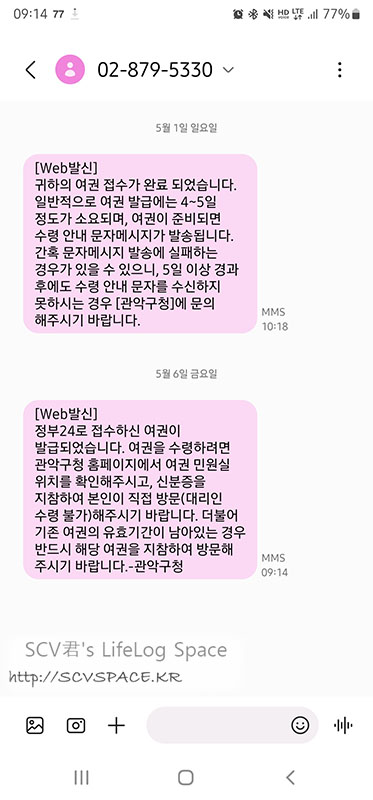 지난주는 4일째인 5/5(목)이 휴일이었기 때문에 그 다음날 수령이 가능하다는 문자가 왔습니다.