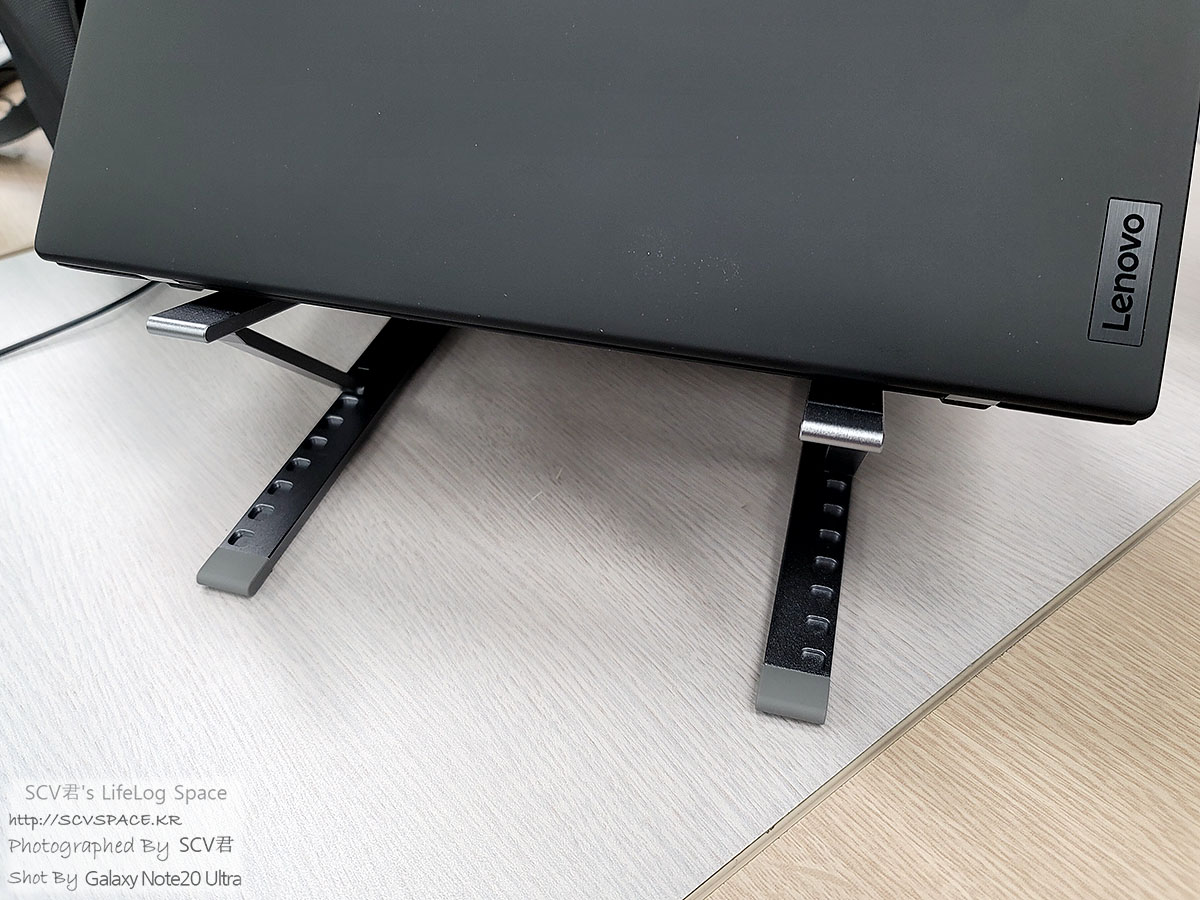 다만 노트북 디스플레이를 책상과 수직으로 열면(노트북 입장에선 90도 이상 열림) 디스플레이가 있는 상판 끝이 조금 거치대와 닿습니다.