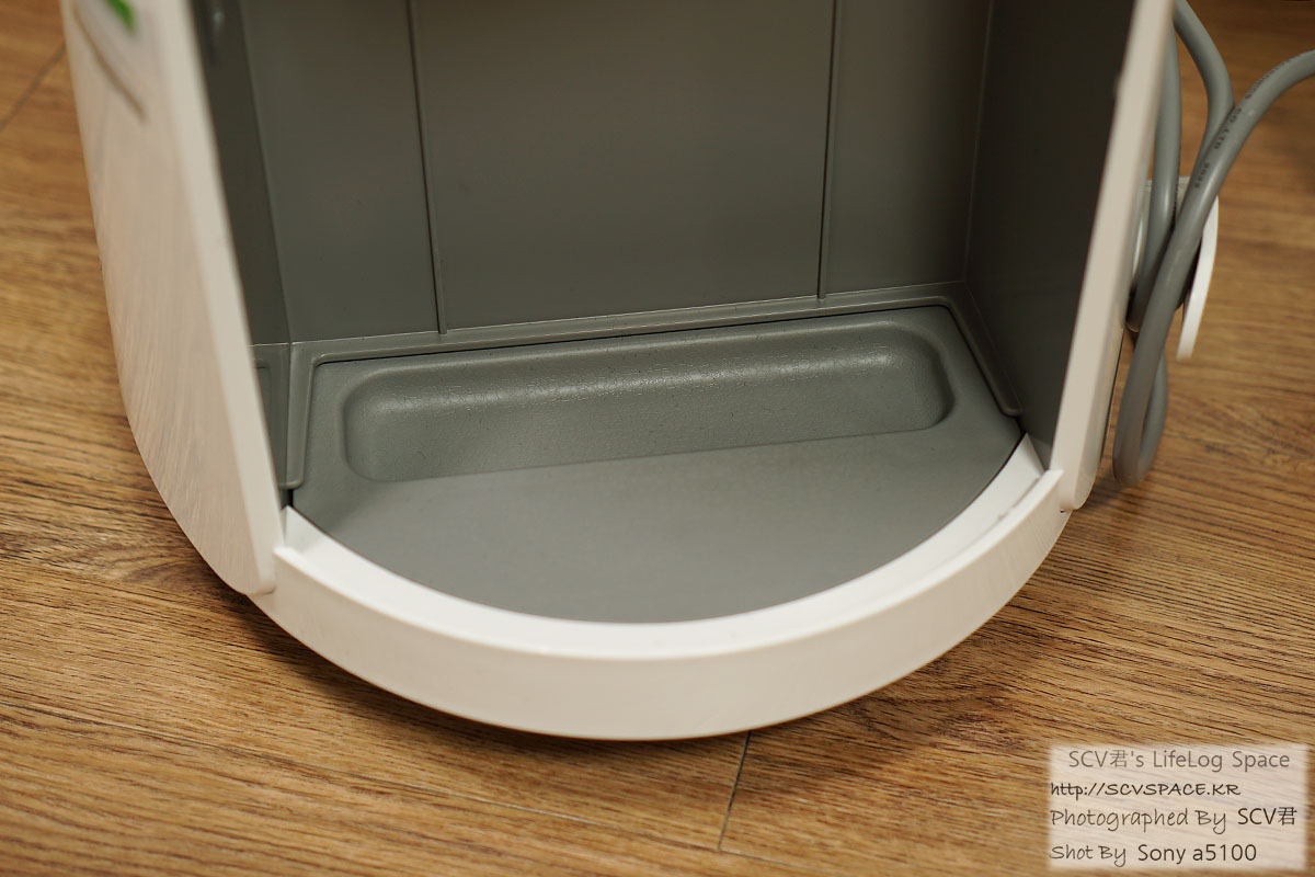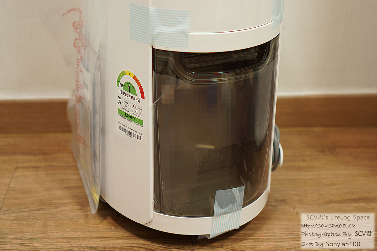 그리고 측면의 물통. 에너지 소비효율등급 스티커 뒤쪽 물통 방향으로는 LED램프도 달려있습니다. 수위확인용인 듯.